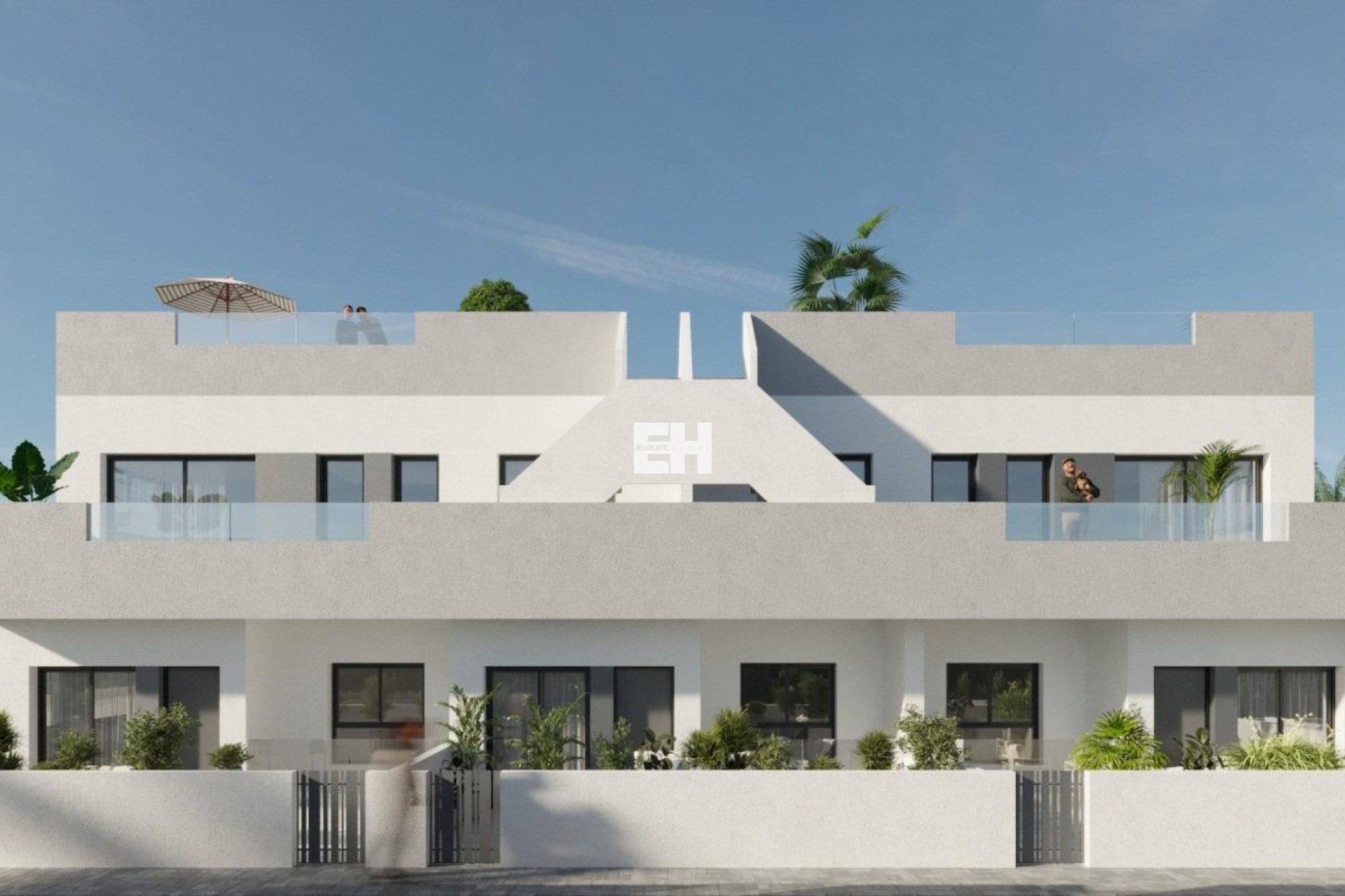 Top-floor bungalows: 2 bedrooms, 2 bathrooms, open-plan kitchen with large living area, terrace, and private solarium, perfect for enjoying the Mediterranean sun.