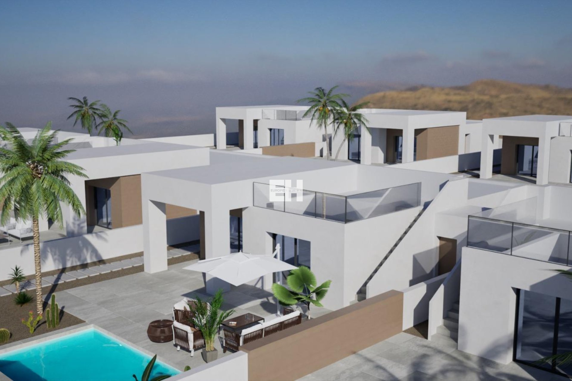 Cada villa ofrece 127 m² de superficie construida distribuidos en 3 dormitorios y 2 baños, incluida una suite principal con baño en suite. La sala de estar y el comedor de planta abierta se integran a la perfección con una cocina amueblada y acceso directo a la terraza y la piscina privada. Otras características adicionales son un trastero/lavadero y un aparcamiento privado dentro de la parcela. Para aquellos que deseen más espacio exterior, existe la opción de añadir un solárium en la azotea con un coste adicional.