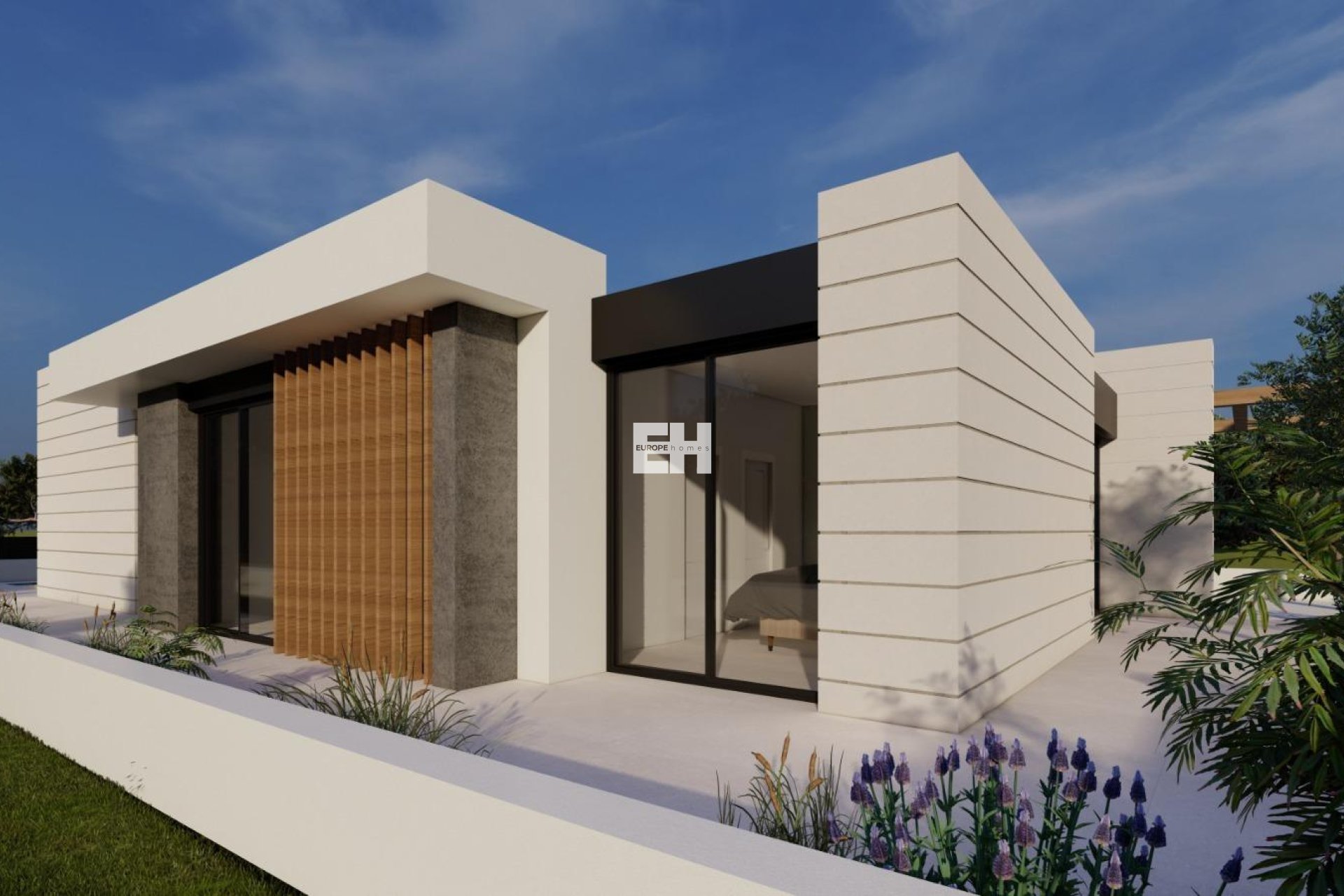 Las villas de obra nueva de una sola planta tienen 3 dormitorios, 2 baños, aseo, cocina americana con salón, armarios empotrados, jardín privado con piscina privada y plaza de aparcamiento.