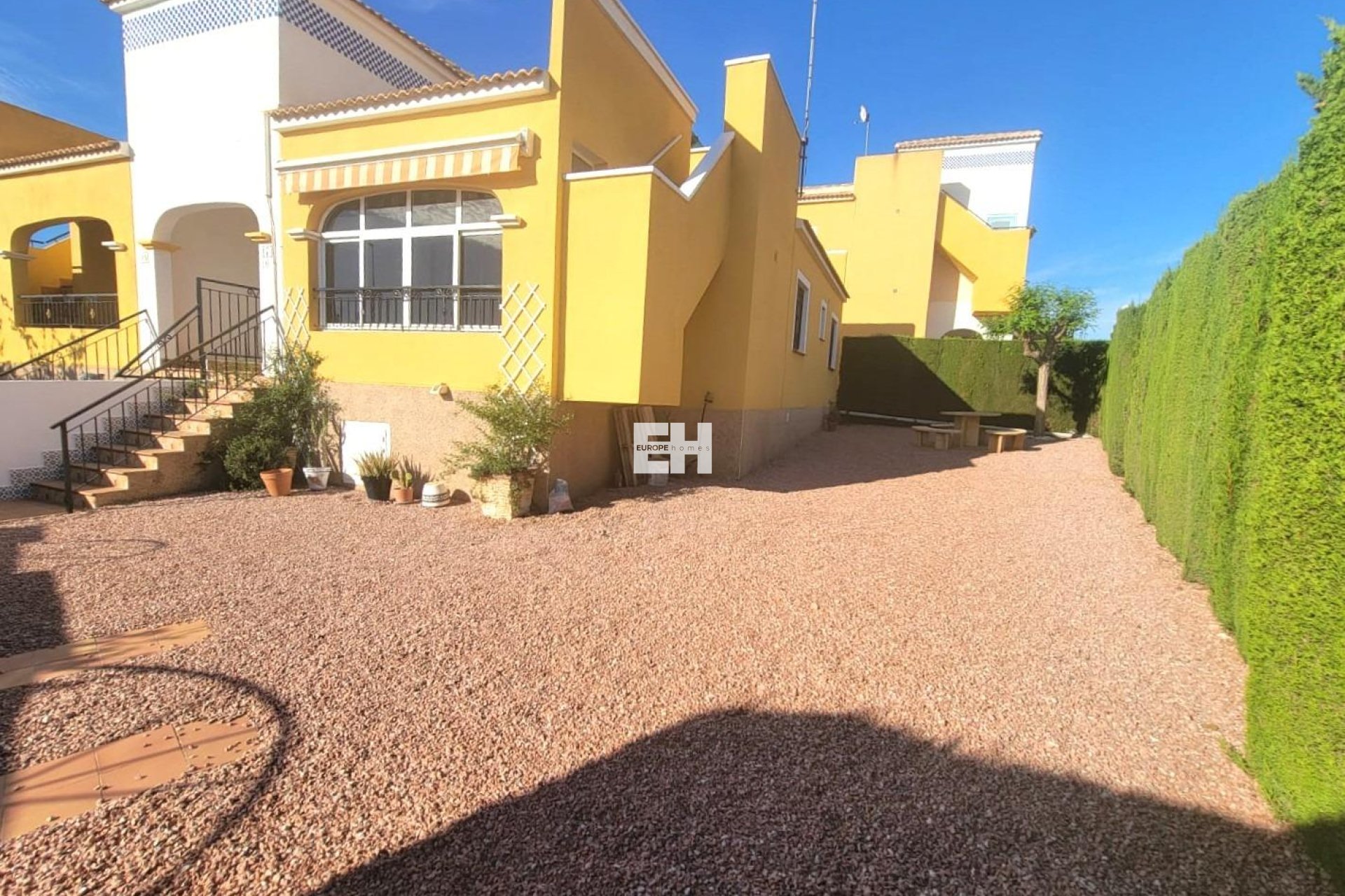 Villa adosada, todo en una planta sin vecinos arriba, en bonita urbanización con piscina y jardines en una zona muy tranquila en Los Montesinos. Dispone de un porche en la entrada a la vivienda, un amplio salón comedor, una cocina independiente totalmente equipada, dos dormitorios dobles, un dormitorio simple, un cuarto de baño con ducha Italiana, un pequeño cuarto con la lavadora, una terraza acristalada, un gran solárium con una pérgola con vistas al paisaje y un jardín enorme de unos 150 m2 vallado con arbolado. Aparcamiento en la parcela privada. Acceso directo desde la calle. Aire acondicionado. SIN muebles. Armarios empotrados en los dormitorios. Ventanas en todas las estancias de la vivienda. Mucha luz natural. En muy buen estado. Con orientación este. Vistas despejadas a los campos, las lagunas,... Todo ello ubicado cerca de todos los servicios, supermercados, cafeterias, del centro del pueblo de Los Montesinos, de la zona de ocio "Greenlands Sport Club", a unos 20 minutos en coche de las playas de Guardamar, La Mata,.... Perfecto para disfrutar del aire libre y del buen clima Mediterráneo durante todo el año!