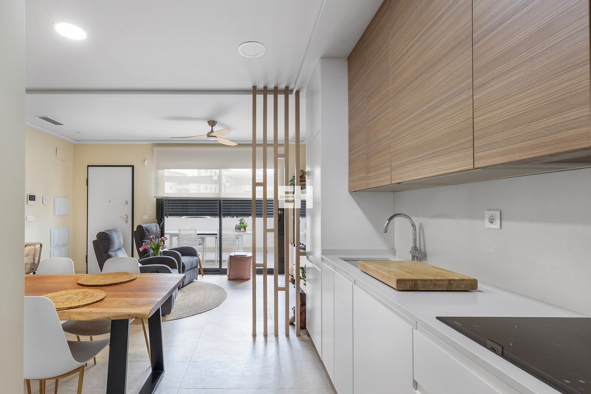 La elegante sala de estar con cocina abierta y totalmente equipada se integra a
