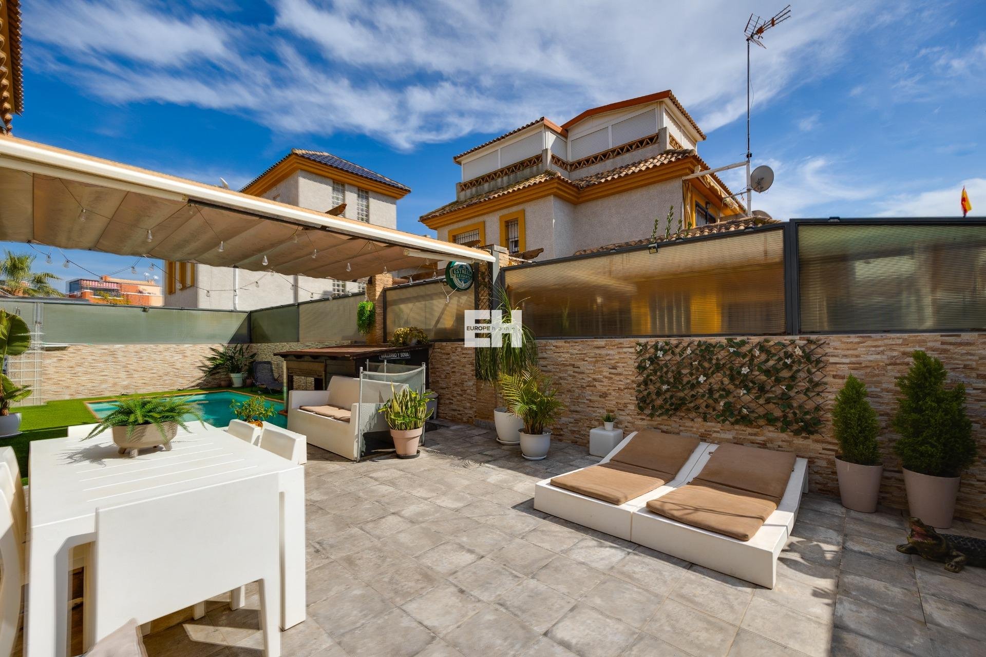 Descubre este encantador chalet independiente situado en La Herrada, en Los Montesinos, una tranquila zona residencial ideal para quienes buscan calidad de vida, privacidad y cercanía a todos los servicios. Además, se encuentra a tan solo 10–15 minutos en coche de las playas de Torrevieja y del centro de la ciudad. La vivienda destaca por su excelente estado de conservación y por el cuidado en cada uno de sus detalles, lo que la convierte en un hogar listo para disfrutar desde el primer día. Al acceder a la propiedad nos recibe un precioso jardín privado con piscina, el espacio perfecto para disfrutar del clima mediterráneo. La piscina cuenta con taburetes estratégicamente situados que crean una original zona de bar dentro del agua, ideal para compartir momentos únicos. El exterior se completa con una zona de barbacoa y un práctico trastero. El chalet se distribuye en tres plantas perfectamente aprovechadas. En la planta baja encontramos un amplio y luminoso salón-comedor, muy acogedor y con acceso directo al jardín, creando una perfecta conexión entre interior y exterior. También dispone de una cocina independiente totalmente equipada, un dormitorio doble y un baño completo con plato de ducha. En la primera planta se encuentran dos dormitorios, uno de ellos especialmente amplio e incluyendo una práctica zona de oficina. En esta planta también hay un baño completo con plato de ducha. Y en la última planta encontramos una zona de lavandería y acceso a un espectacular solárium privado con impresionantes vistas panorámicas despejadas a la Laguna Rosa, un lugar privilegiado para disfrutar de los atardeceres y del entorno natural. La vivienda cuenta además con aire acondicionado, calefacción y se vende completamente amueblada y equipada, lista para entrar a vivir y empezar a disfrutarla desde el primer momento. Una propiedad única que combina comodidad, privacidad y una ubicación privilegiada. ¡CONTACTANOS!
