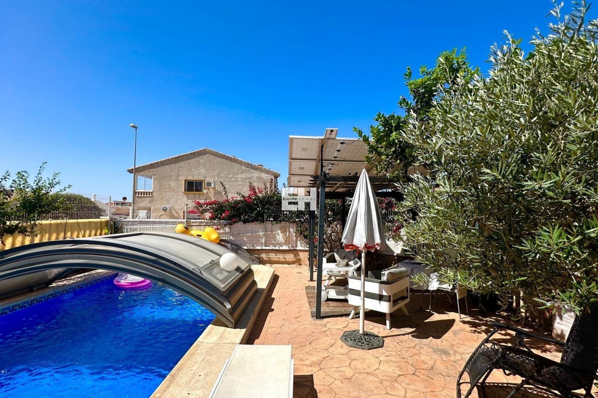 Chalet Independiente en Esquina con Piscina Propia y Solárium – A tan solo 1 km del mar Te presentamos esta magnífica propiedad situada en una exclusiva urbanización residencial a tan solo un kilómetro de la costa. Se trata de un chalet independiente en esquina que ofrece privacidad, confort y una excelente calidad de vida tanto para residencia habitual como para segunda vivienda cerca del mar. Distribución y espacios exteriores Con una parcela de 200 m² y 119 m² construidos, esta vivienda se distribuye en tres plantas que maximizan el espacio y la funcionalidad. La propiedad cuenta con acceso para vehículo y aparcamiento dentro de la parcela, así como con su propia piscina privada, todo rodeado por un jardín bien mantenido y zonas de terraza ideales para disfrutar del aire libre. Además, forma parte de una urbanización que ofrece también piscina comunitaria, brindando más opciones de ocio sin salir del entorno. Primera planta: zonas comunes y confort Al acceder a la vivienda nos recibe un hall acristalado que aporta luminosidad y amplitud desde el primer momento. En esta planta se encuentra un moderno cuarto de baño completo, una cocina independiente de diseño actual, completamente equipada con electrodomésticos de calidad, una despensa adicional y un salón comedor amplio y luminoso. Desde el salón se accede a una terraza acristalada con vistas directas a la piscina privada y al jardín, creando un ambiente perfecto para reuniones familiares o momentos de relax. Segunda planta: zona de descanso En la planta superior encontramos tres habitaciones dobles, todas con armarios empotrados. La habitación principal cuenta con su propio cuarto de baño en suite, garantizando intimidad y comodidad. Además, hay un segundo baño completo que da servicio al resto de habitaciones. Tercera planta: solárium y trastero La tercera planta alberga un práctico trastero y un amplio solárium privado, ideal para tomar el sol, colocar una zona chill-out o incluso un pequeño huerto urbano. Desde aquí se pueden disfrutar de vistas despejadas y un entorno tranquilo. Extras y eficiencia energética La vivienda está equipada con aire acondicionado en todas las estancias para asegurar el máximo confort durante todo el año. Además, dispone de placas solares ya instaladas, lo que contribuye a un consumo energético más eficiente, reduciendo significativamente los costes eléctricos y promoviendo un estilo de vida más sostenible. Resumen de características: Chalet independiente en esquina Parcela de 200 m² 119 m² construidos Piscina privada y piscina comunitaria 3 plantas 3 habitaciones con armarios empotrados 3 baños (1 en suite) Cocina independiente equipada Salón comedor + terraza acristalada Trastero y solárium privado Aire acondicionado en todas las estancias Placas solares para autoconsumo Parking dentro de la parcela A solo 1 km del mar Una vivienda perfecta para quienes buscan espacio, privacidad y un entorno tranquilo con todos los servicios cerca y el mar a solo unos minutos. ¿Te gustaría agendar una visita o recibir más información? Estamos a tu disposición.