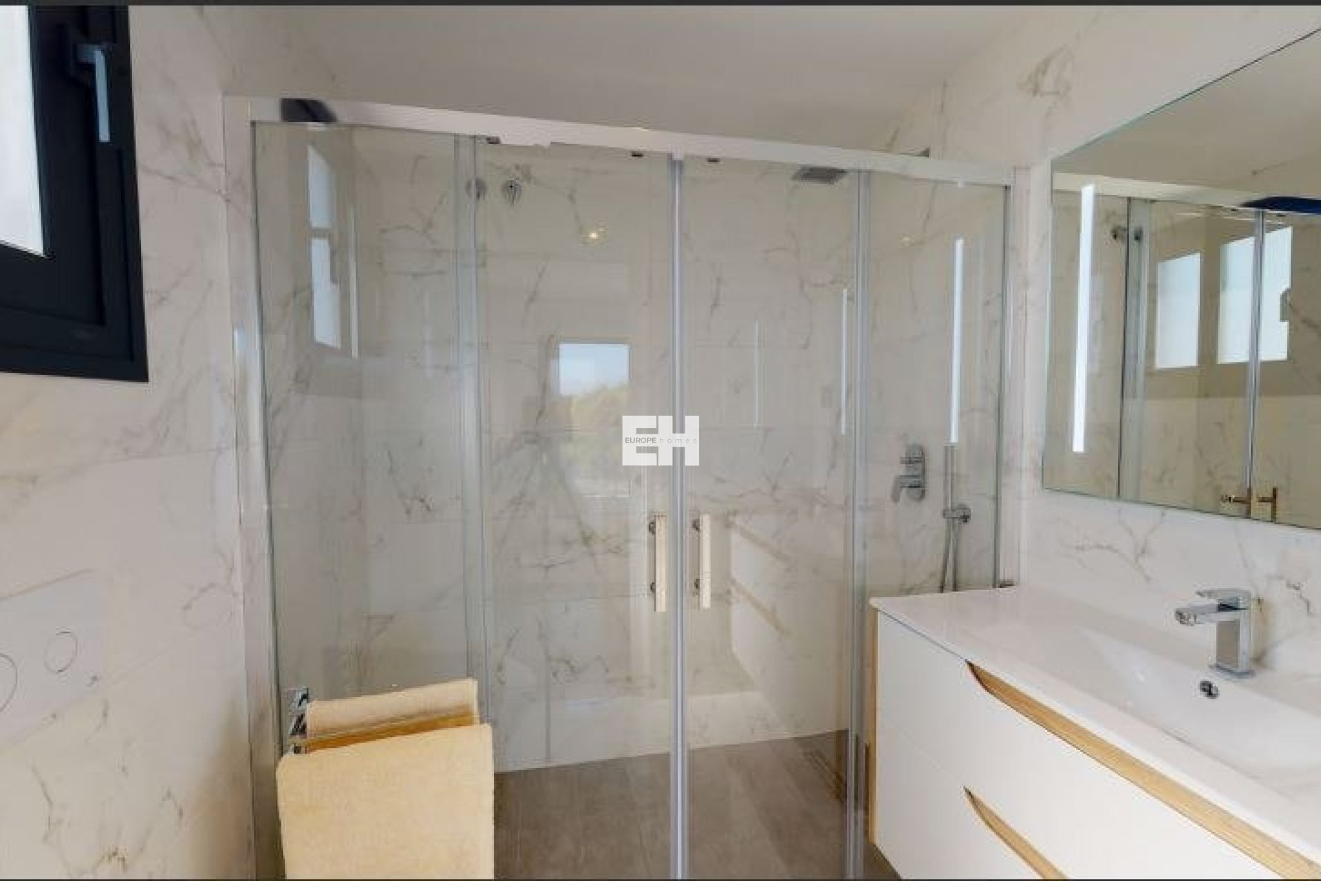 Es gibt 4 komplett ausgestattete Badezimmer mit Glaswänden, Porzellantoiletten und Thermostatarmaturen in den Duschen, eines im ersten Stock, ein weiteres in der Garage und die anderen 2 en suite in den Zimmern im ersten Stock.