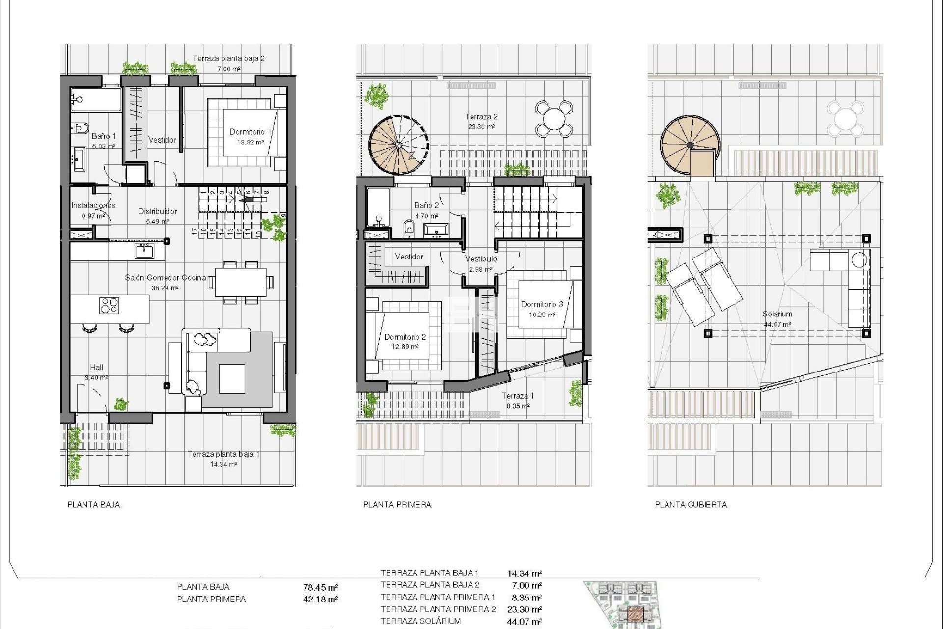 Propriétés modernes avec 3 chambres spacieuses avec armoires encastrées (la principale au rez-de-chaussée, avec salle de bain et dressing en suite), 2 salles de bain spacieuses, grand salon-salle à manger avec cuisine ouverte, terrasses spacieuses.