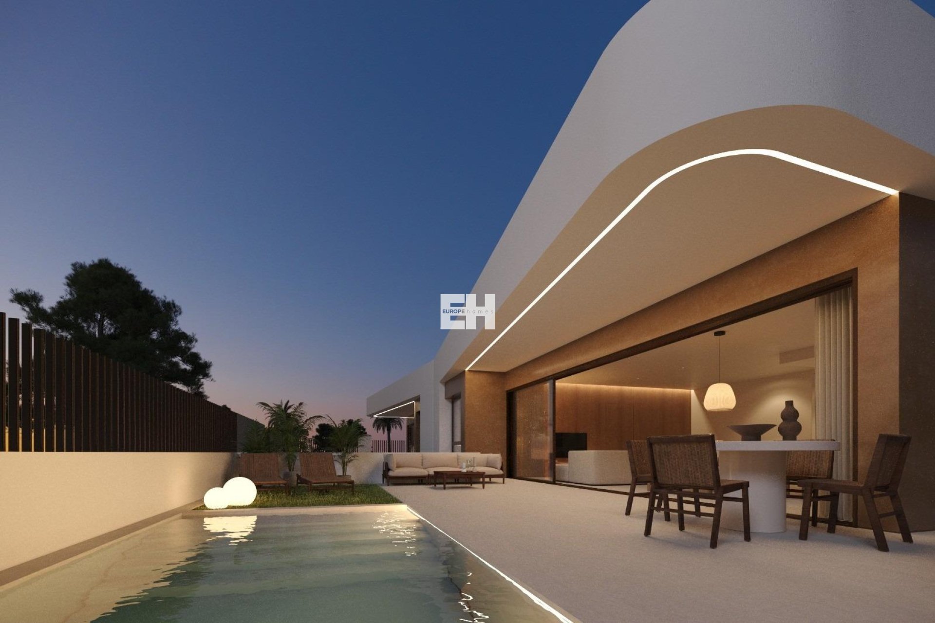 À l'intérieur, les villas offrent un salon et une salle à manger ouverts, lumineux et élégants, avec une cuisine moderne intégrée et un îlot central. De grandes portes coulissantes avec rails encastrés créent une transition harmonieuse entre les espaces intérieurs et extérieurs, offrant un accès direct au jardin, à la piscine et au parking. Cette disposition bien pensée améliore la lumière naturelle et crée une atmosphère accueillante pour la vie quotidienne et les réceptions.