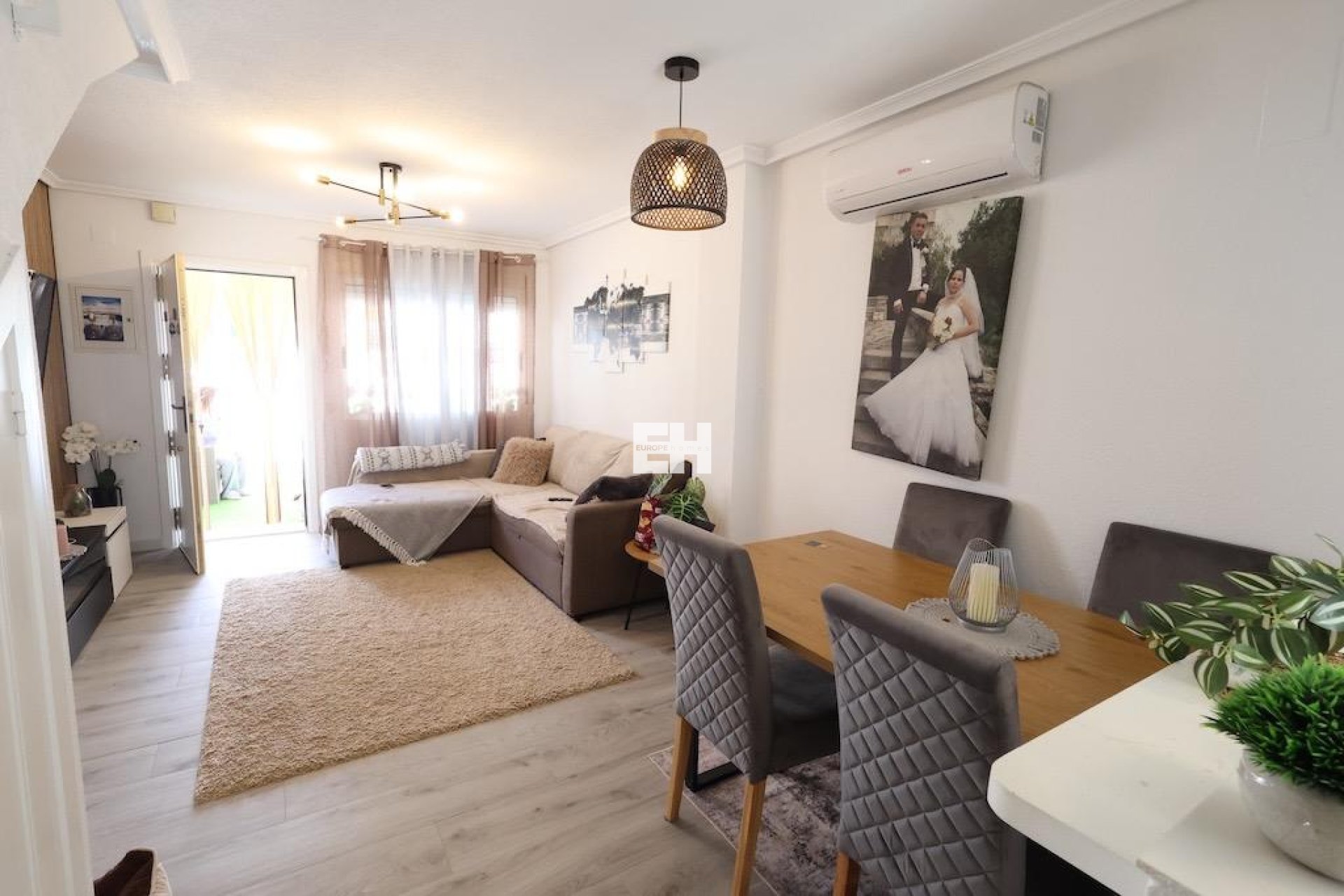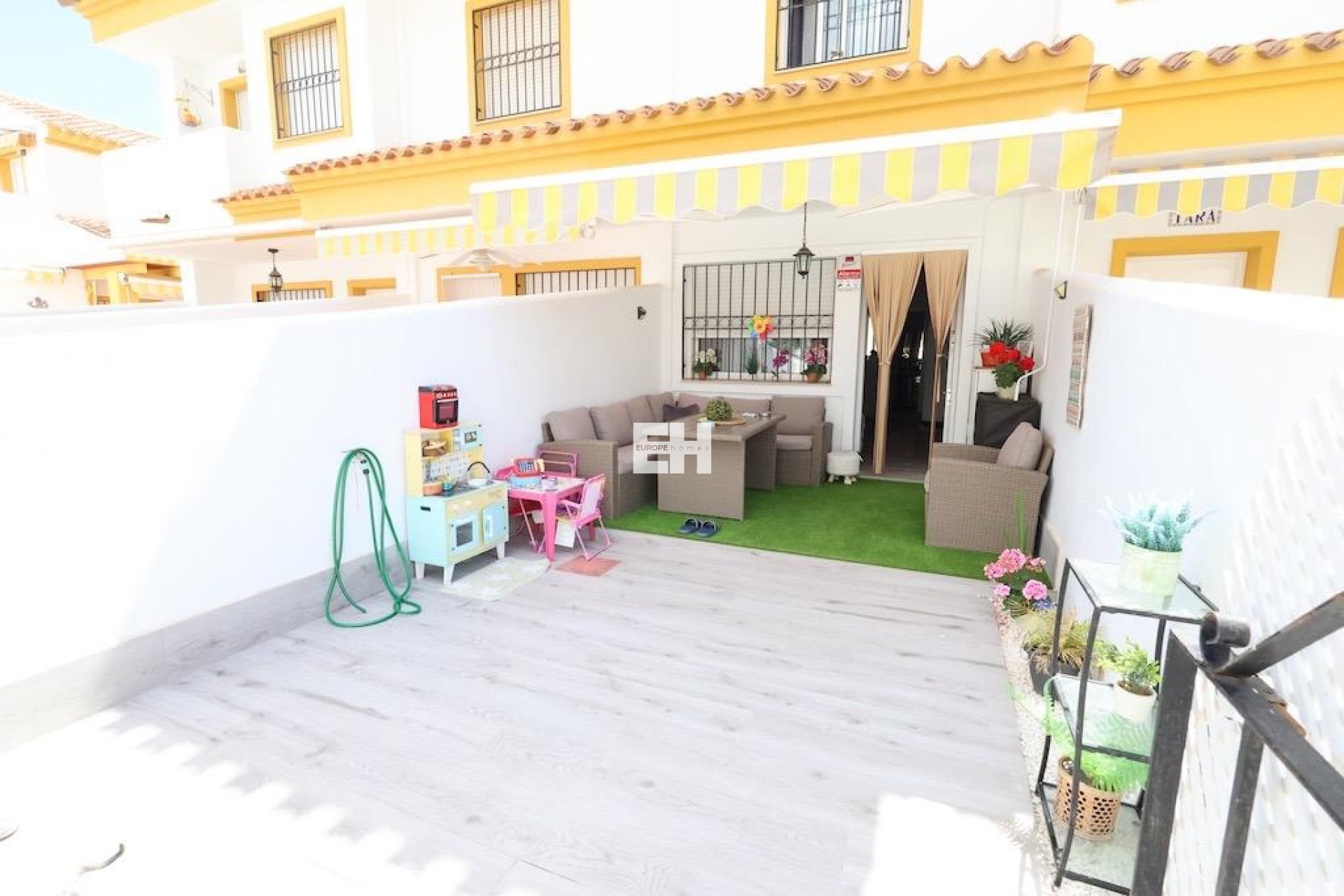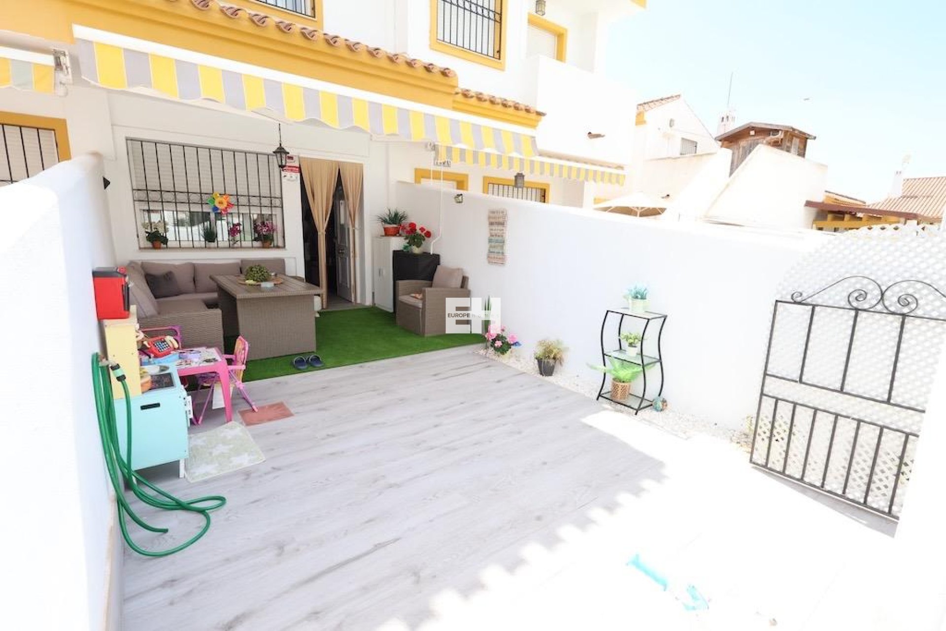 Torre de la Horadada – Résidentiel Cañada Real . Nous vous présentons ce charmant duplex mitoyen situé juste en face de la piscine communautaire, dans l’un des complexes résidentiels les plus agréables de la région.. . Le logement offre une surface construite de 70 m², répartie sur deux chambres, deux salles de bains, un salon-salle à manger lumineux, une cuisine américaine entièrement équipée, ainsi qu’un grand patio arrière, idéal pour une buanderie ou un espace de rangement.. . À l’avant, une grande terrasse carrelée d’environ 20 m² permet un accès direct à la piscine, parfaite pour profiter du soleil et des espaces verts environnants. . La maison est vendue entièrement meublée et équipée, y compris la climatisation.. . La résidence propose de vastes espaces verts et deux piscines communautaires, offrant un environnement calme, familial et bien entretenu, à seulement quelques minutes de la plage et de tous les services.
