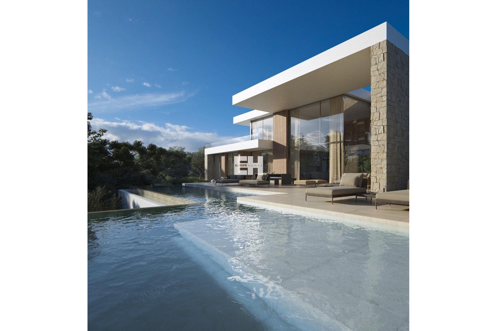 De begane grond beschikt over een grote open woon- en eetruimte die direct aansluit op de terrassen en het zwembad. Kamerhoge ramen openen de hele ruimte naar buiten toe, waardoor een lichte en luchtige sfeer ontstaat en het panoramische uitzicht wordt omlijst.