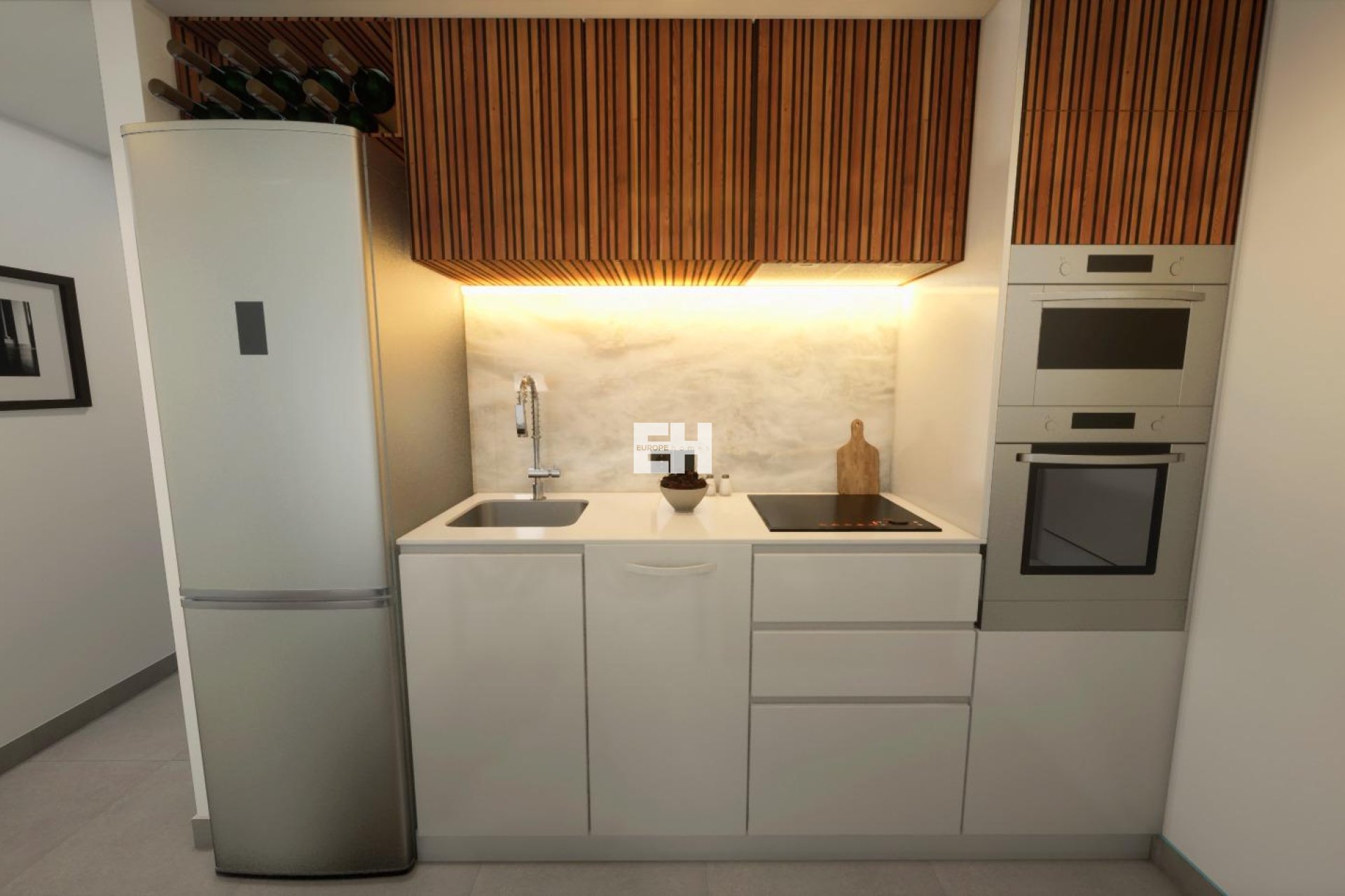 Cocina equipada con electrodomésticos: frigorífico, horno elevado, microondas empotrado, vitrocerámica, campana extractora y lavavajillas integrado