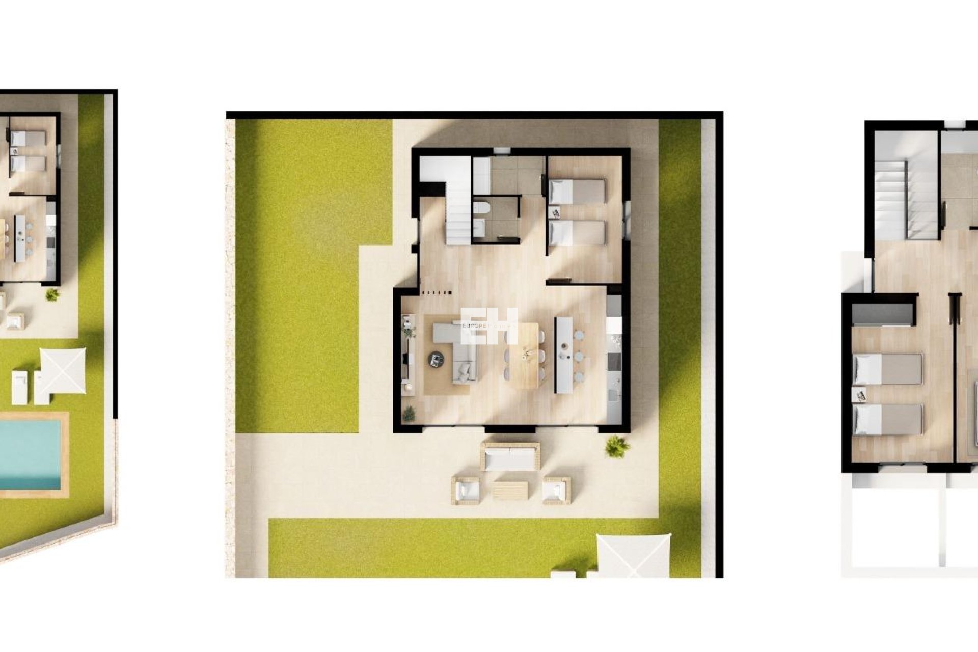 Bonitas villas con 4 dormitorios, 3 baños, cocina americana con el salón, armarios empotrados, jardín privado con la piscina y plaza de aparcamiento.