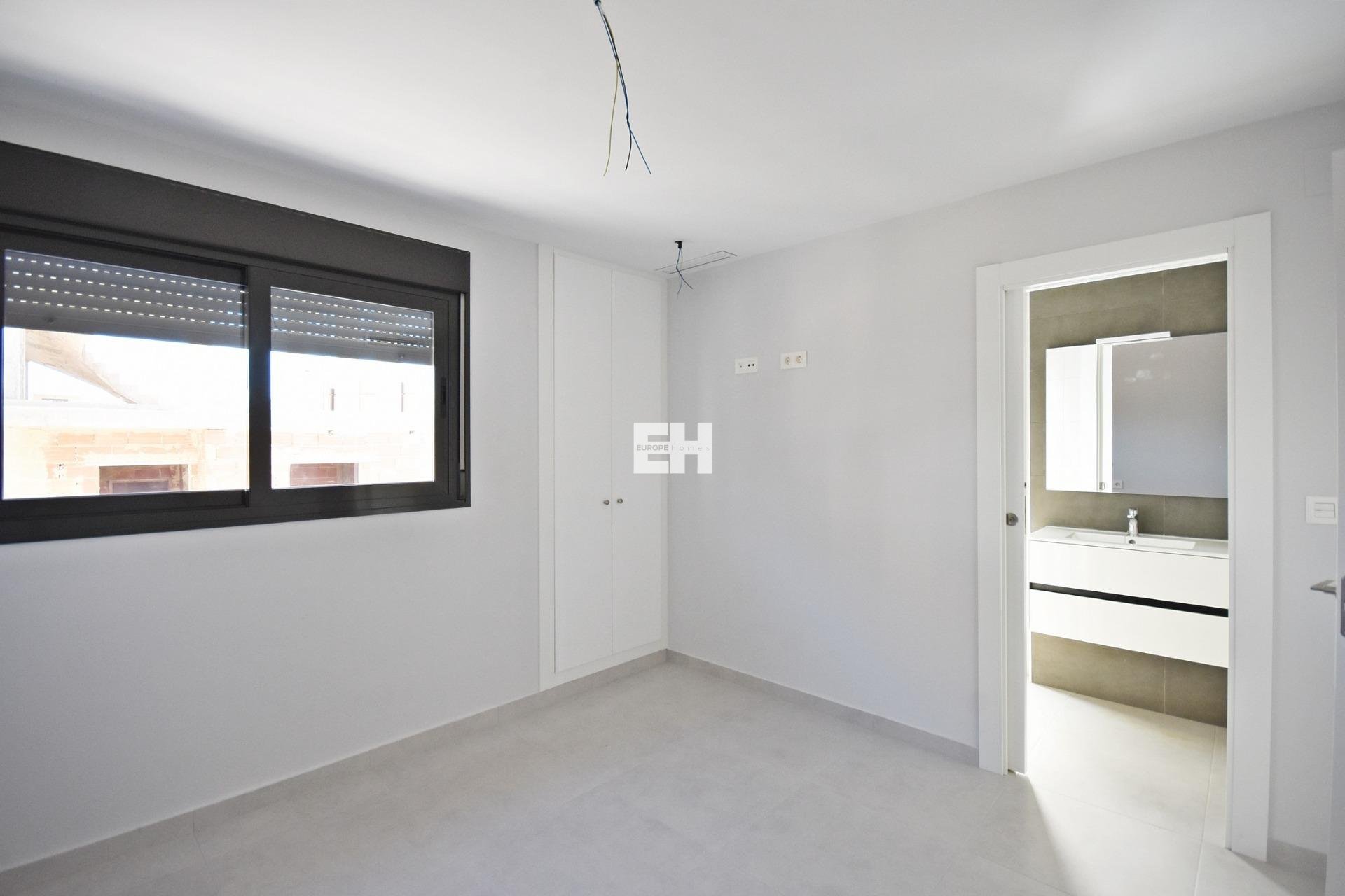 Cada villa ofrece una superficie construida de 101 m² en una parcela en esquina de 126 m², distribuida en dos plantas más un solárium. En la planta baja se encuentra un luminoso salón, una cocina independiente con acceso a la parte trasera de la parcela, un dormitorio doble y un cuarto de baño completo. La primera planta cuenta con dos dormitorios, uno con acceso a dos terrazas con vistas abiertas y el otro con baño en suite, además de un baño familiar adicional. La planta superior está dedicada a un solárium privado de 31 m² con impresionantes vistas al mar, perfecto para tomar el sol, comer al aire libre o relajarse con los amigos.