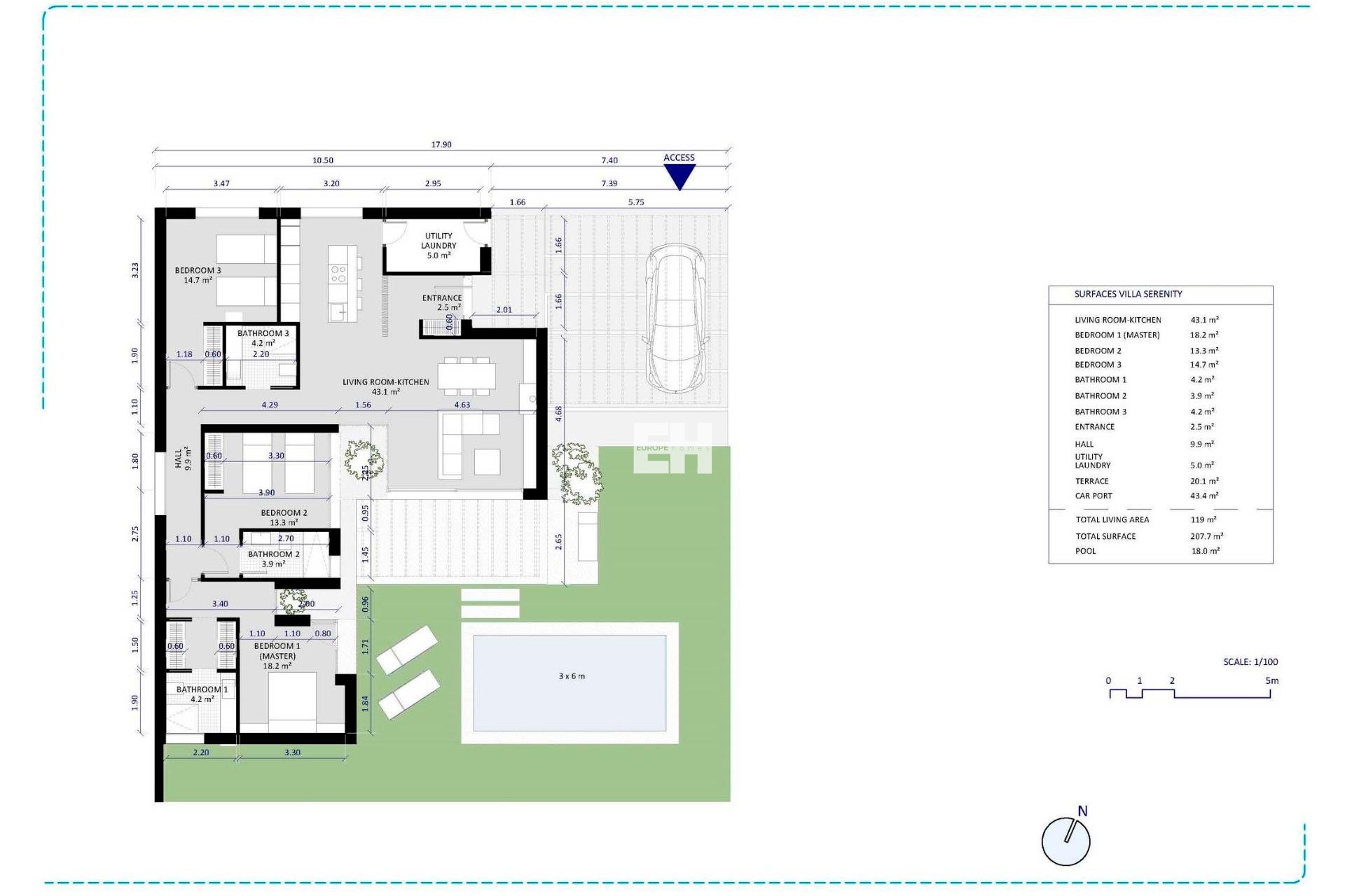 La hermosa villa de 1 nivel tiene 3 dormitorios, 3 baños, cocina americana con zona de estar, jardines privados con la piscina y plaza de aparcamiento.